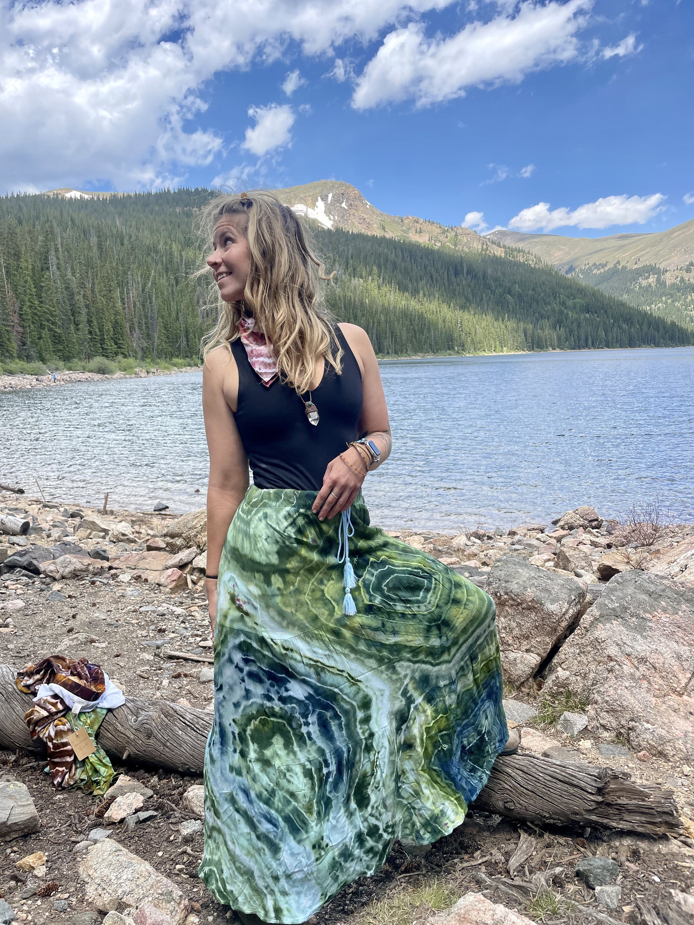 cotton stretch maxijuniors large / women's medium- largestretchy ! tie at top cinch waist Ice dyed Hand tied with Sinew cottonhand made with love & Intention !